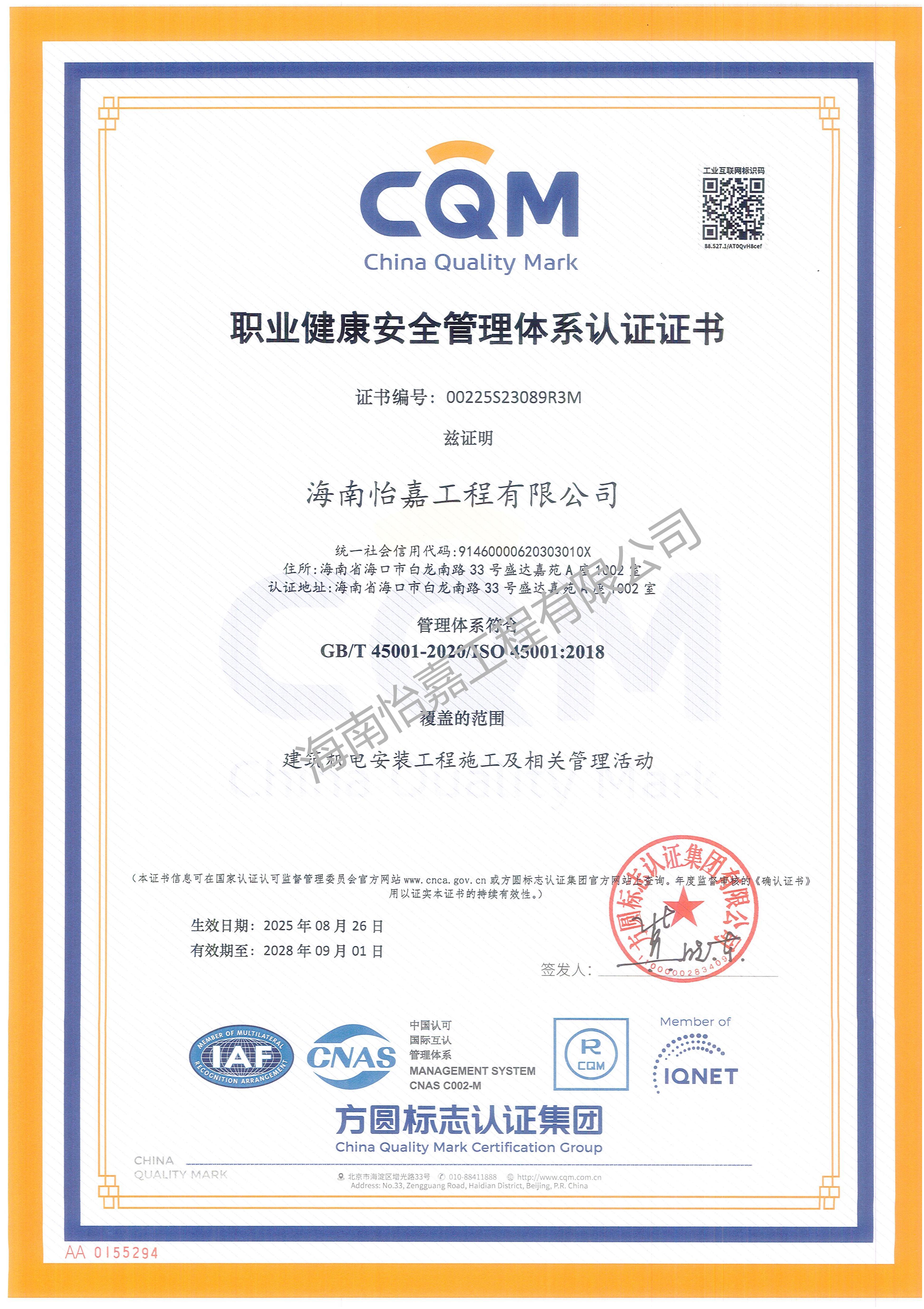 职业健康安全管理体系认证证书-2025